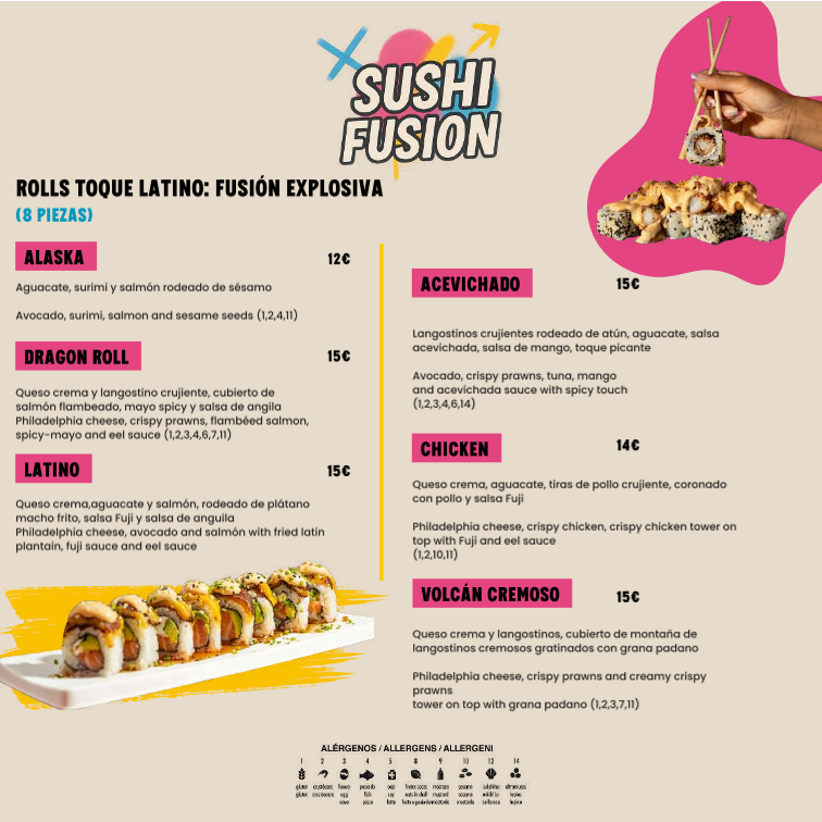 Dragón roll, Acevichado roll, Chicken Roll, Volcán Cremoso, Tiger roll