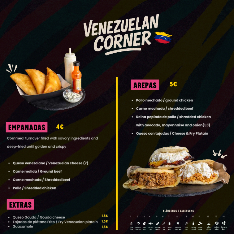 - Venezuelan Corner: With empanadas starting at €4.00 and arepas at €5.00, there's something for every palate.